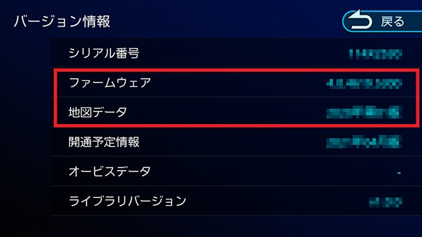 4)「ファームウェア」、「地図データ」のバージョンを確認する。