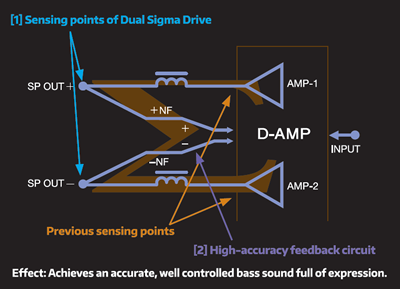 Este avanzado circuito de realimentación negativa mejora el factor de amortiguación y aumenta la fidelidad y la calidad del sonido. Cuando una señal pasa por un altavoz de graves, como una nota de 50 hercios, el altavoz se moverá y creará la nota. Sin embargo, como el altavoz tiene masa y suspensión, no parará de moverse una vez que esté en movimiento. Este movimiento extra (sonido) crea un tipo de distorsión que no es parte de la señal original. El circuito de realimentación negativa detecta este movimiento indeseado y como si fuera un freno electrónico manda un pulso contrario para detener el altavoz.