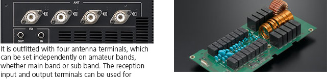 The built-in automatic antenna tuner is a preset type that covers amateur band frequencies ranging from 160m~6m, and is completely operable during receive. The tuner is capable of rapid QSY based on instantaneous band change, using a relay system known for high-speed operations.