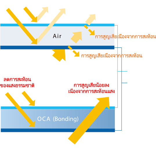 กาวใสออปติคอล (OCA) ถูกเพิ่มเข้าไประหว่างหน้าจอสัมผัสและ LCD เพื่อกำจัดชั้นอากาศและลดการสะท้อนแสงและแสงจ้า คุณสมบัตินี้ช่วยเพิ่มความคมชัดและความสว่างและรักษาระดับการมองเห็นของจอแสดงผลในสภาพแวดล้อมต่างๆ