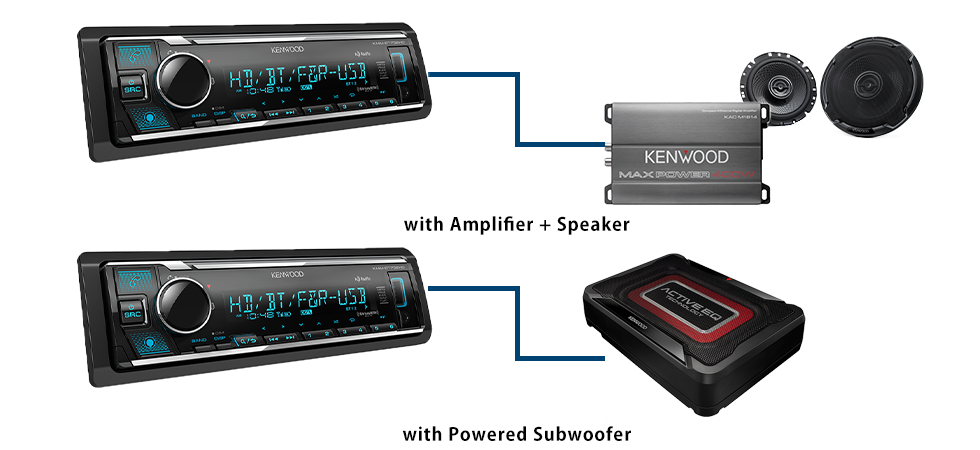 The KENWOOD receiver has RCA outputs to expand the system to connect to an additional amplifier or powered subwoofer.