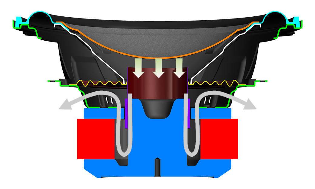 Airflow cooling system allows air to flow from the cap, cooling the voice coil.