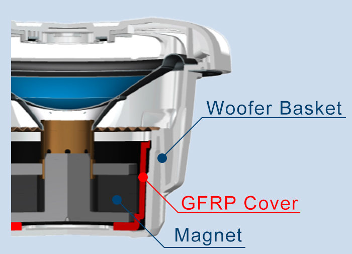Glass Fiber Reinforced Plastics (GFRP) protect the woofer basket from the magnet’s heat, stabilizing its sound and condition.