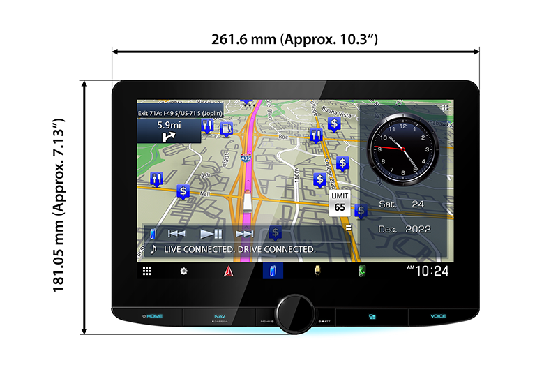 The 10.1" home screen is composed of a Driving Widget as well as a Source Control Widget overlaid on the background. You can move the Driving Widget from side to side or enlarge the Source Control Widget to optimize the screen for your intuitive operation. The Driving Widget allows selection of a clock, compass, or equalizer setting, etc., while the background allows selection of album art, audio visualizer, or photo.