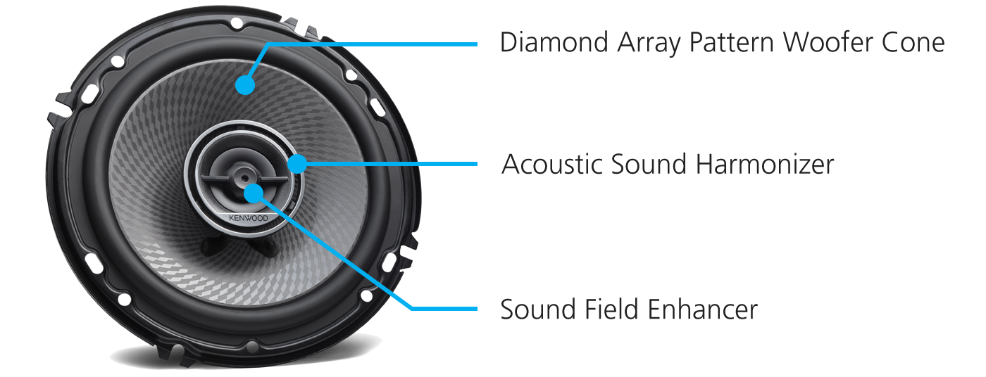 This unique shape of the tweeter creates strong frontward sound as well as a wider sound field in 5kHz and higher frequencies.