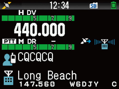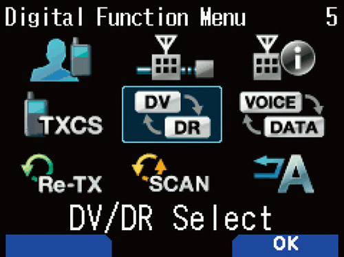 The unit employs a separate menu for D-STAR and its many modes, such as switching between simplex (DV) and repeater (DR), or voice and data, enabling operation switching with a single touch.