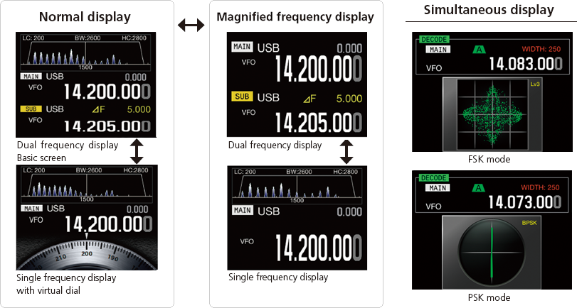 The 3.5" TFT sub band display is located above the main knob, which not only reduces eye movement in reading the frequency, but also allows you to monitor the target signal itself by displaying the demodulated audio spectrum. In addition, filter effects can be displayed on the easy-to-see sub band display, allowing for intuitive operation. You can switch the sub band display among the four different view modes below according to your intention.